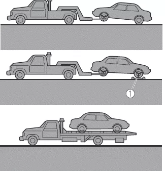 Zum Abschleppen eines Fahrzeugs sollten normalerweise die Antriebsräder (Vorderräder) angehoben werden. Falls das Fahrzeug wegen starker Beschädigung oder aus einem anderen Grund nicht angehoben werden kann, müssen Radkarren verwendet werden.