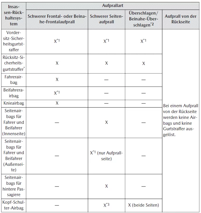 *2 Bei Überschlagen des Fahrzeugs werden die Sicherheitsgurtstraffer und die