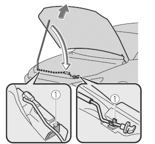3. Halten Sie die Stützstange an der Umhüllung und bringen Sie sie an der mit dem Pfeil bezeichneten Stelle an, um die Motorhaube abzustützen.